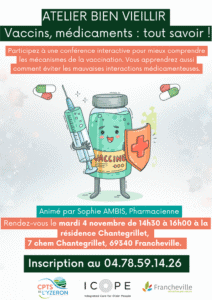 Il propose un temps d’échanges et d’information pour mieux comprendre l’importance de la vaccination et sécuriser l’usage de ses traitements au quotidien. Vous y découvrirez comment vous protéger efficacement grâce aux vaccins, éviter les interactions médicamenteuses et bénéficier d’un accompagnement personnalisé grâce au bilan de médication. Accessible et concret, cet atelier permet à chacun de devenir acteur de sa santé tout en recevant des conseils fiables dispensés par une professionnelle.